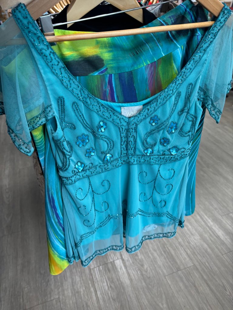 As I walk in on my left is the summer tops rail, which was very very kind to me, with beautiful sequin and beaded tops being the recurring theme for today! With old label new look, bay and monsoon the quality was out of this world, the blue top still new with tags and others with hardly any signs of wear – it is my lucky day! The skirt features in these pics as it had beautiful sequins hemmed along the bottom: keeping my theme going.